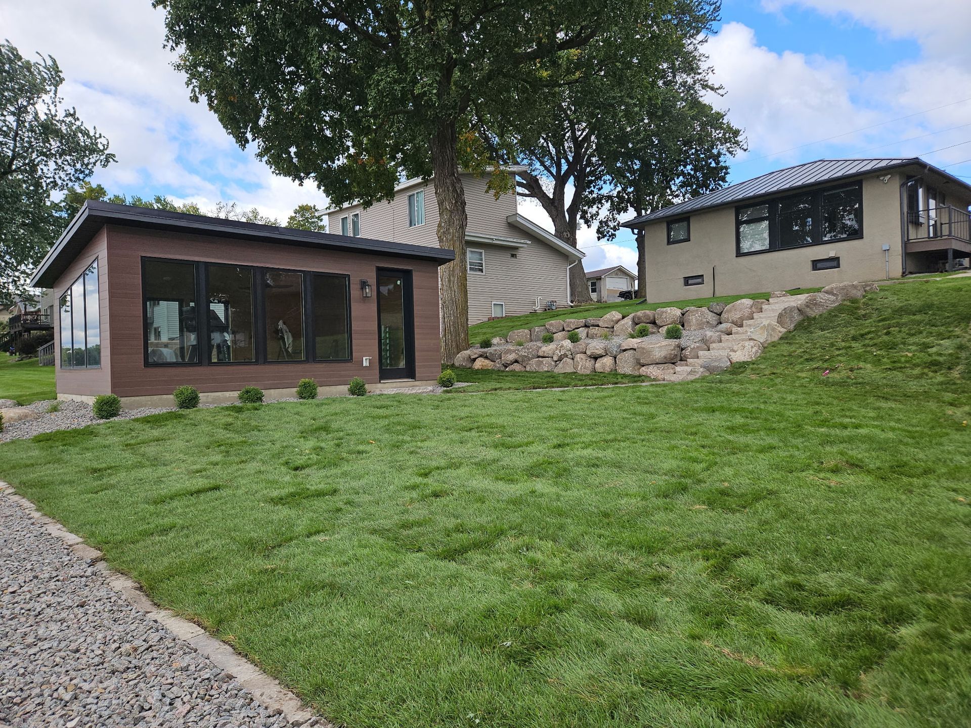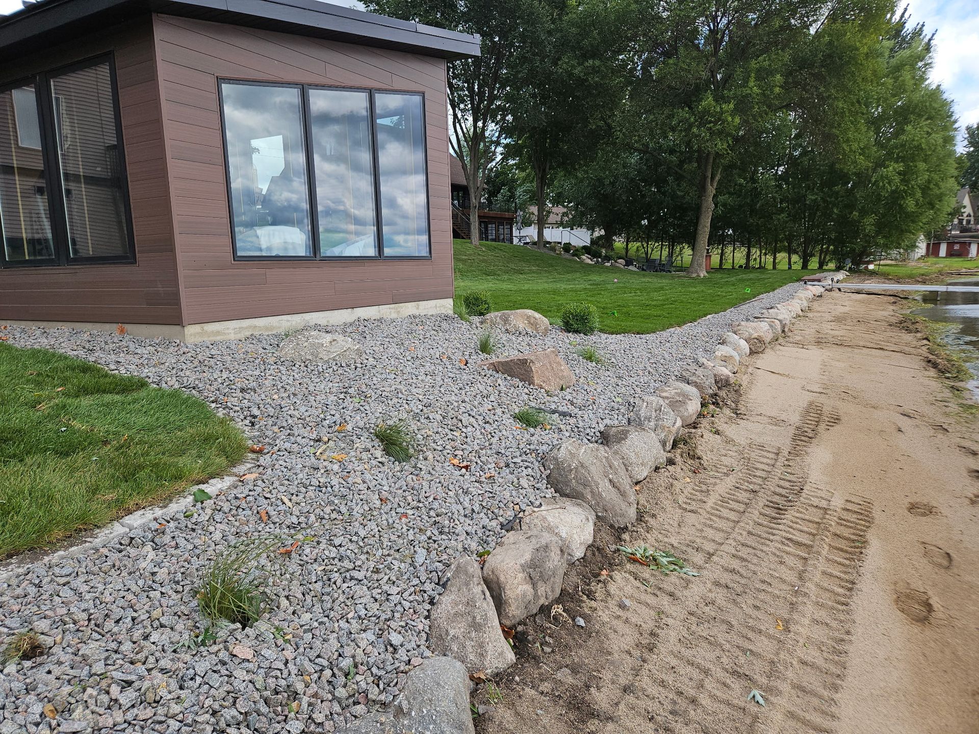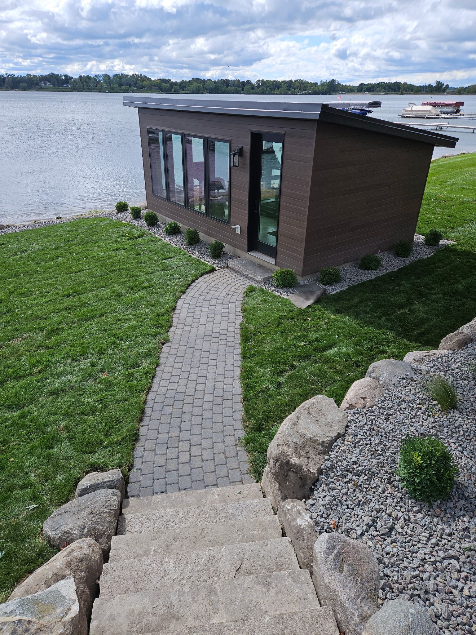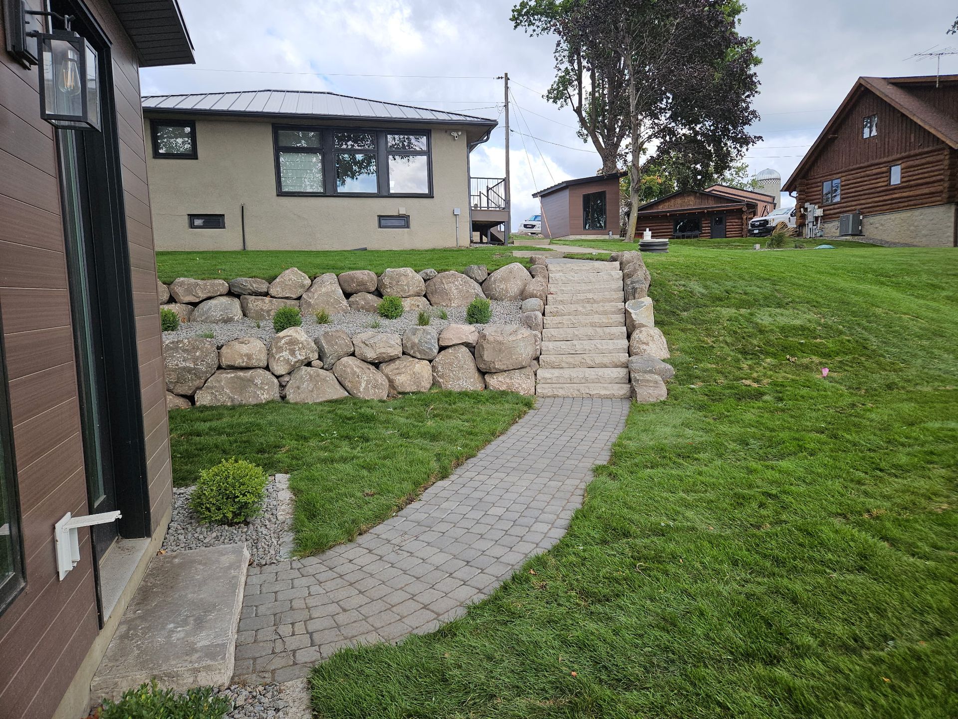 Boathouse and Sauna Project - Boulder walls, walkways, steps, and lawn in Maple Lake, MN